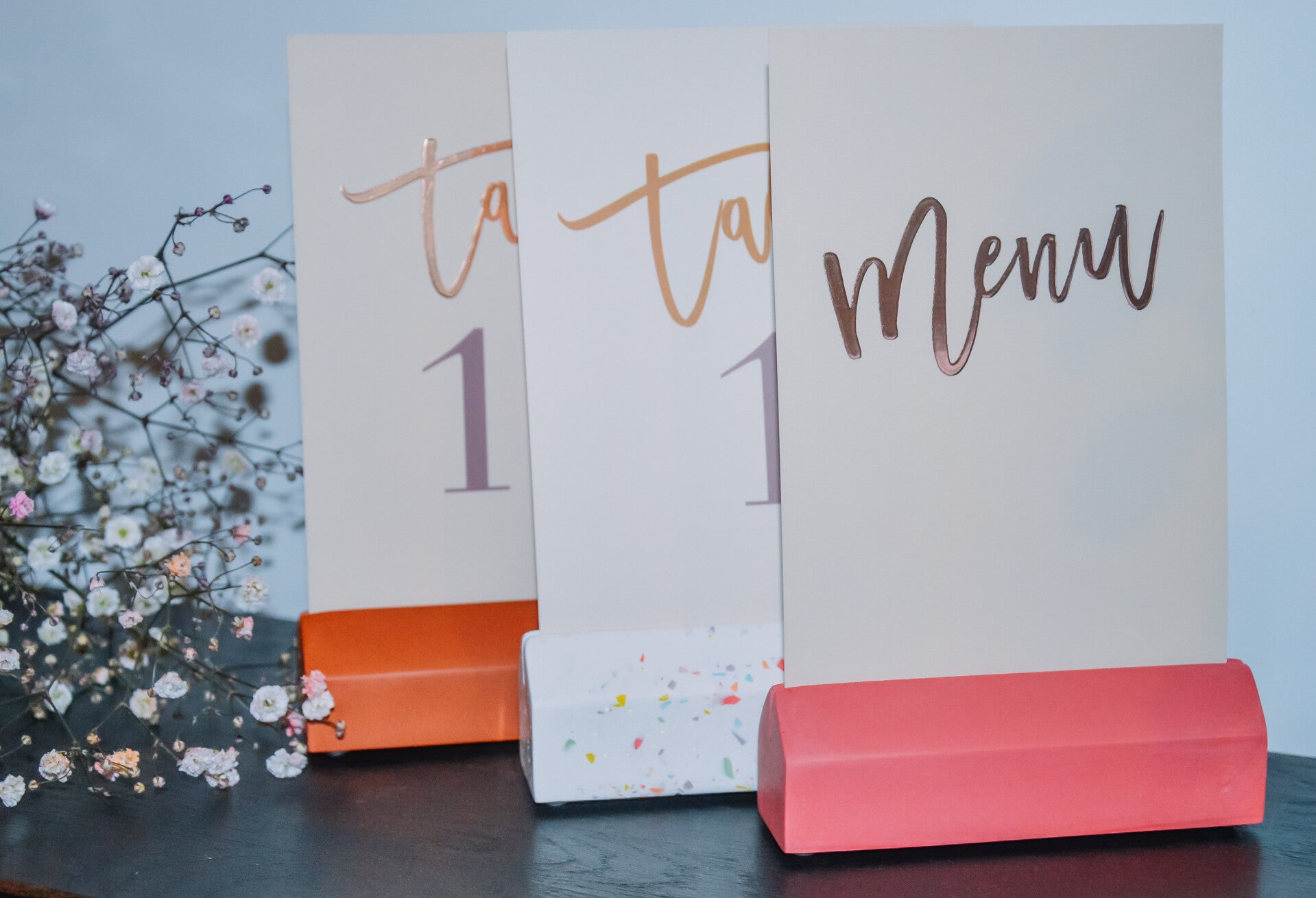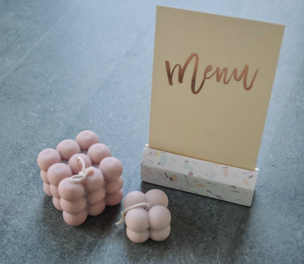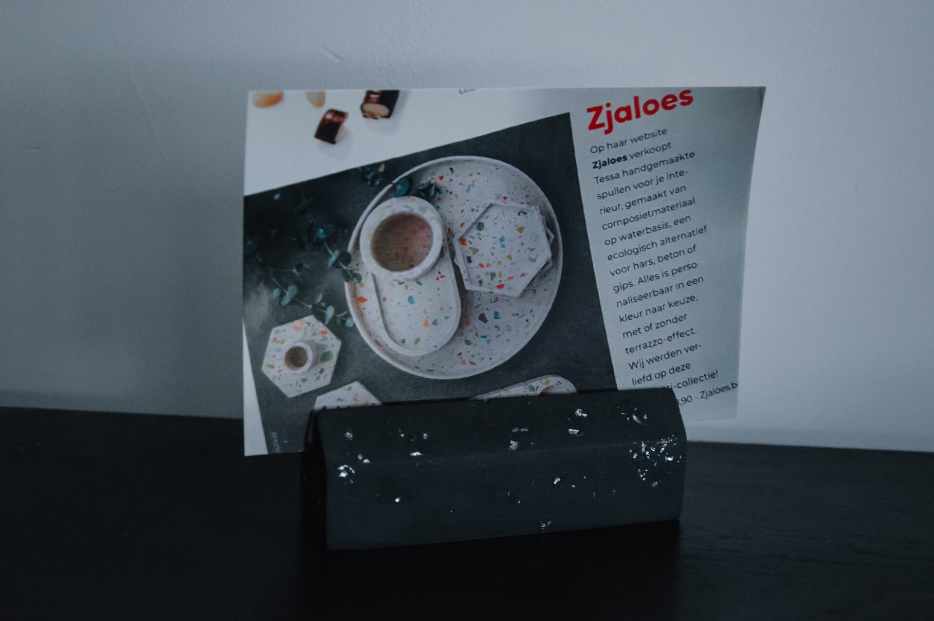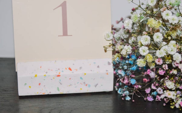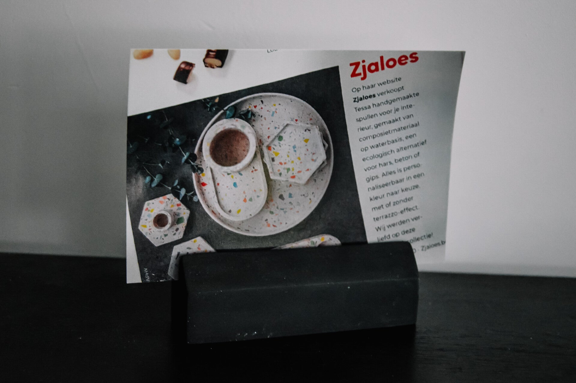 Kaart- en/of fotohouder, te verkrijgen in terrazzo of simpelweg in een kleur naar keuze.